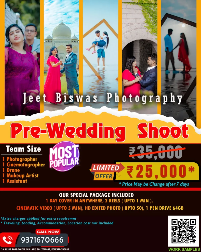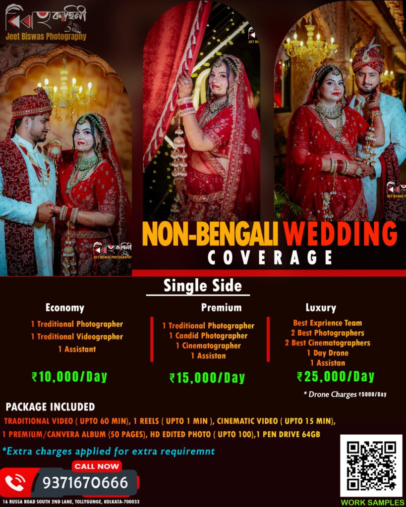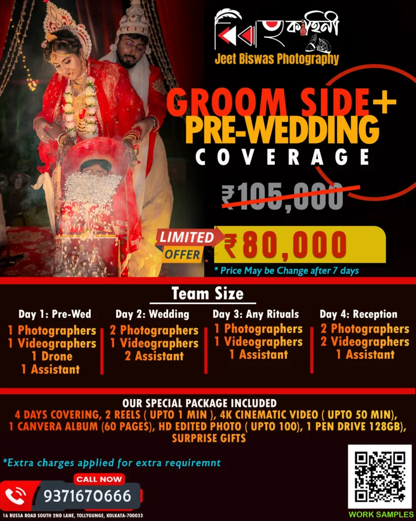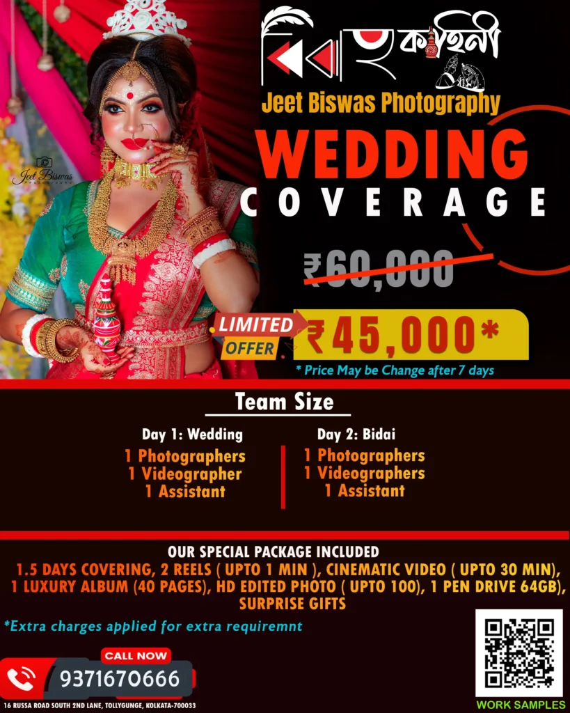 💍 Our wedding photography packages are affordable, customizable, and designed for every budget. Whether it’s an intimate ceremony or a royal destination wedding, Jeet Biswas Photography promises the best price, best service, and the best wedding photography experience in Kolkata.